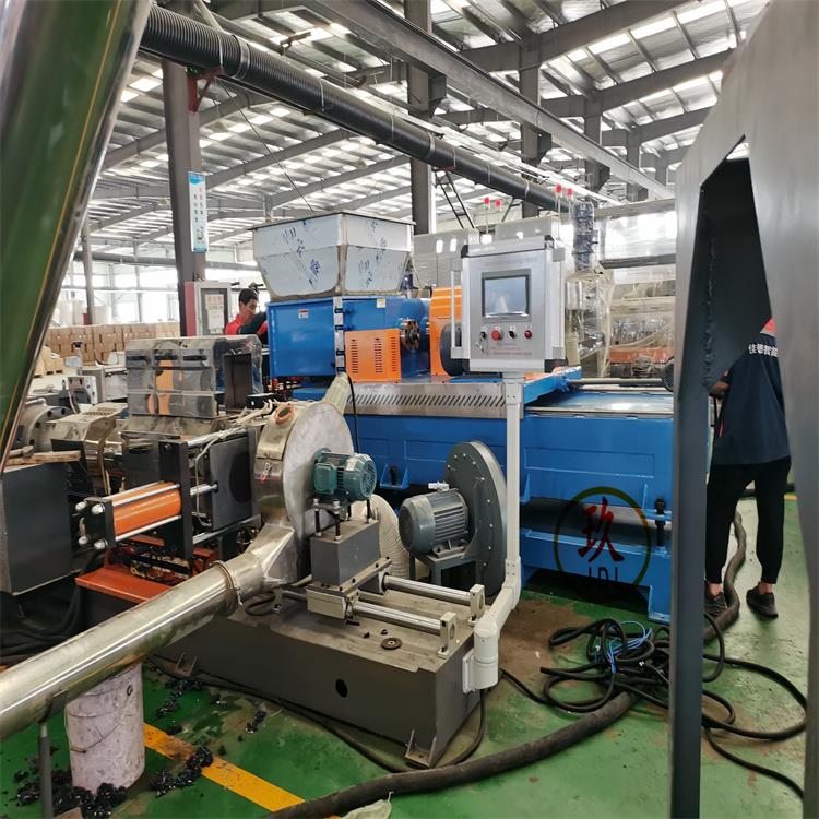 造粒工藝:密煉機——自動提升機——推拉式錐雙喂料機——雙螺桿擠出機——單螺桿擠出機——液壓板式自動換網——風冷模面熱切造粒輔機——一級旋風分離器——二級旋風分離器----風冷振動篩(2.5m) ——風吹料倉一套