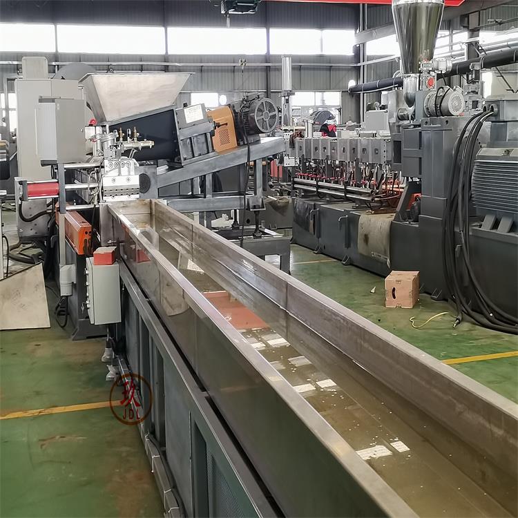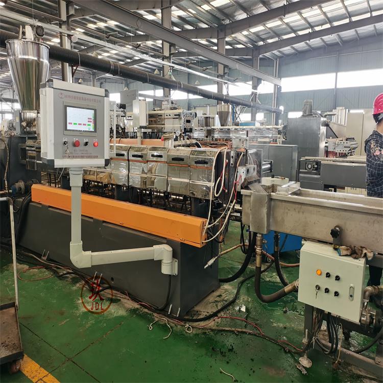 造粒工藝:雙螺桿計(jì)量式喂料——-JDL-75B雙螺桿擠出機(jī)---—液壓板式換網(wǎng)——拉條機(jī)頭----6米不銹鋼水槽-----吹干機(jī)----龍門切粒機(jī)-----2.5米加長(zhǎng)振動(dòng)篩-----主機(jī)采用:PLC控制